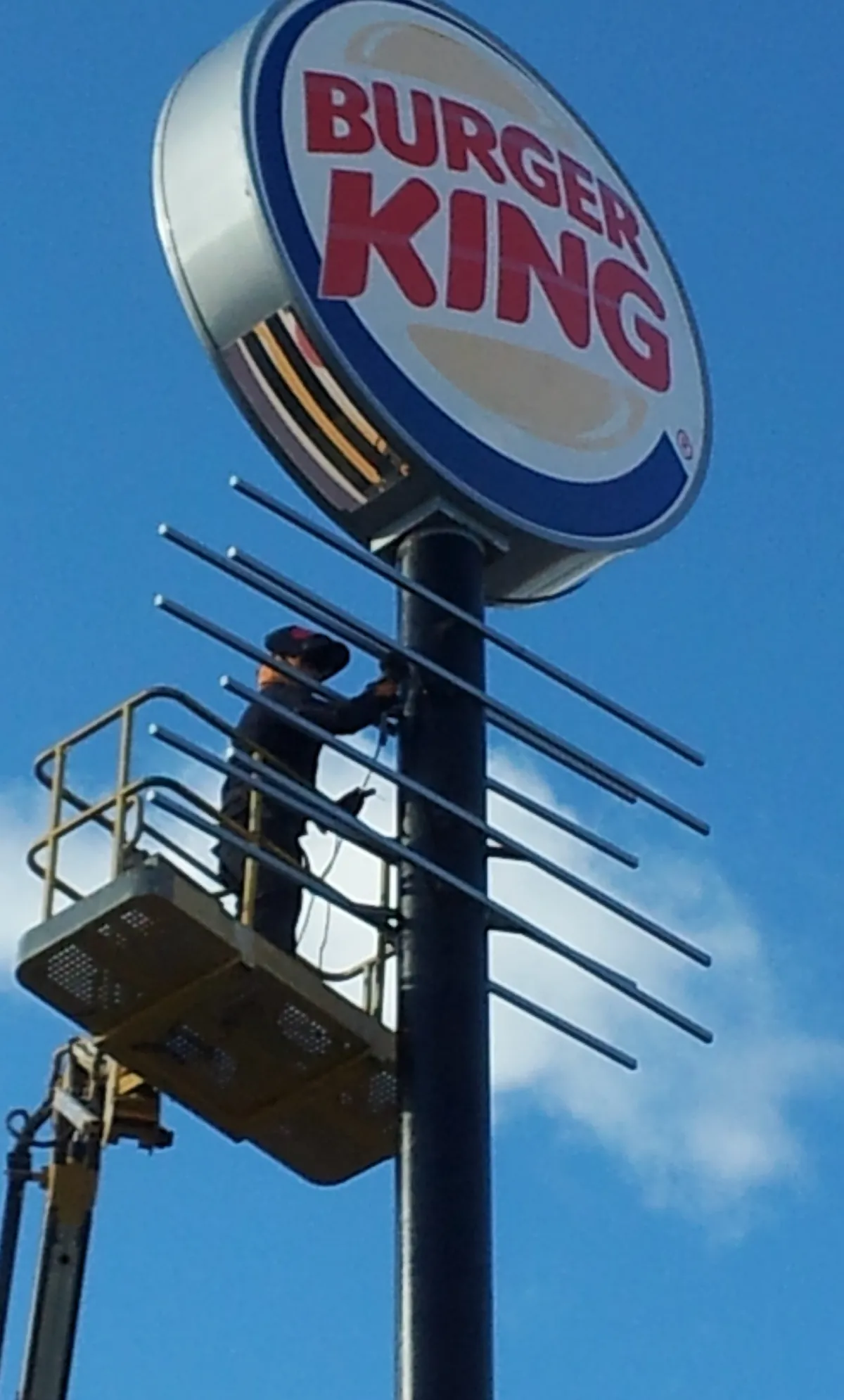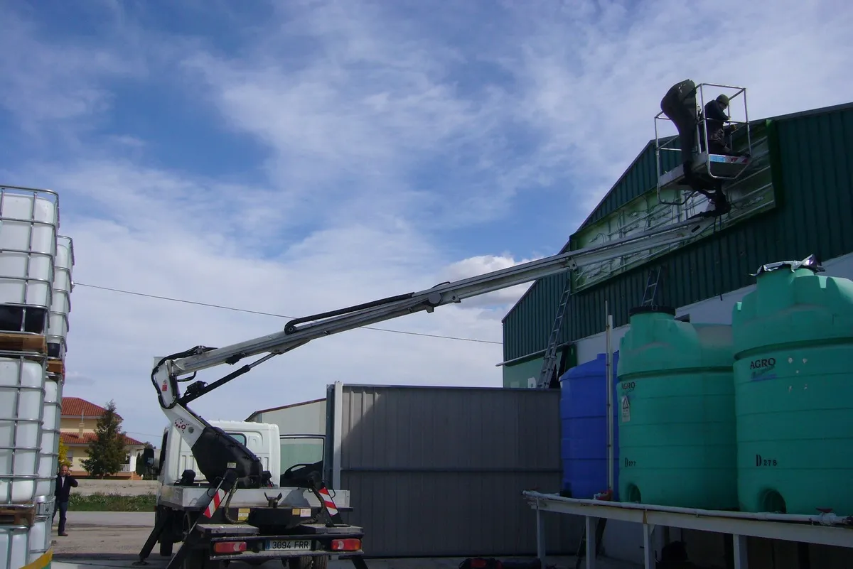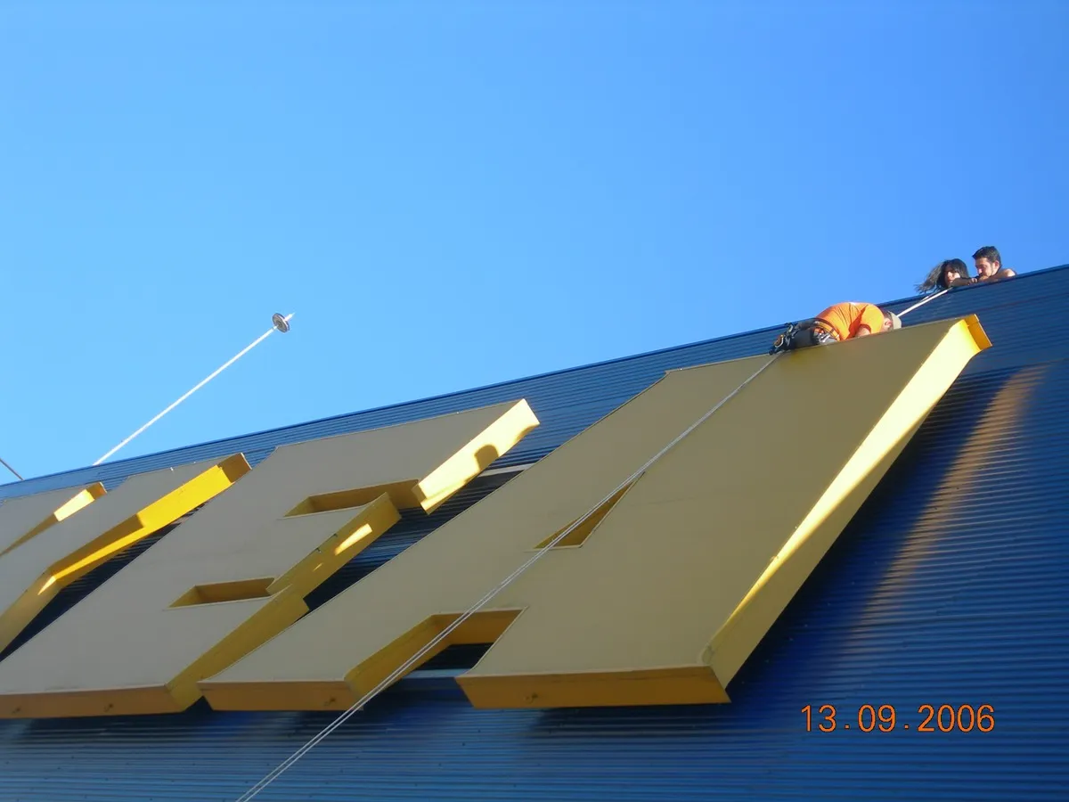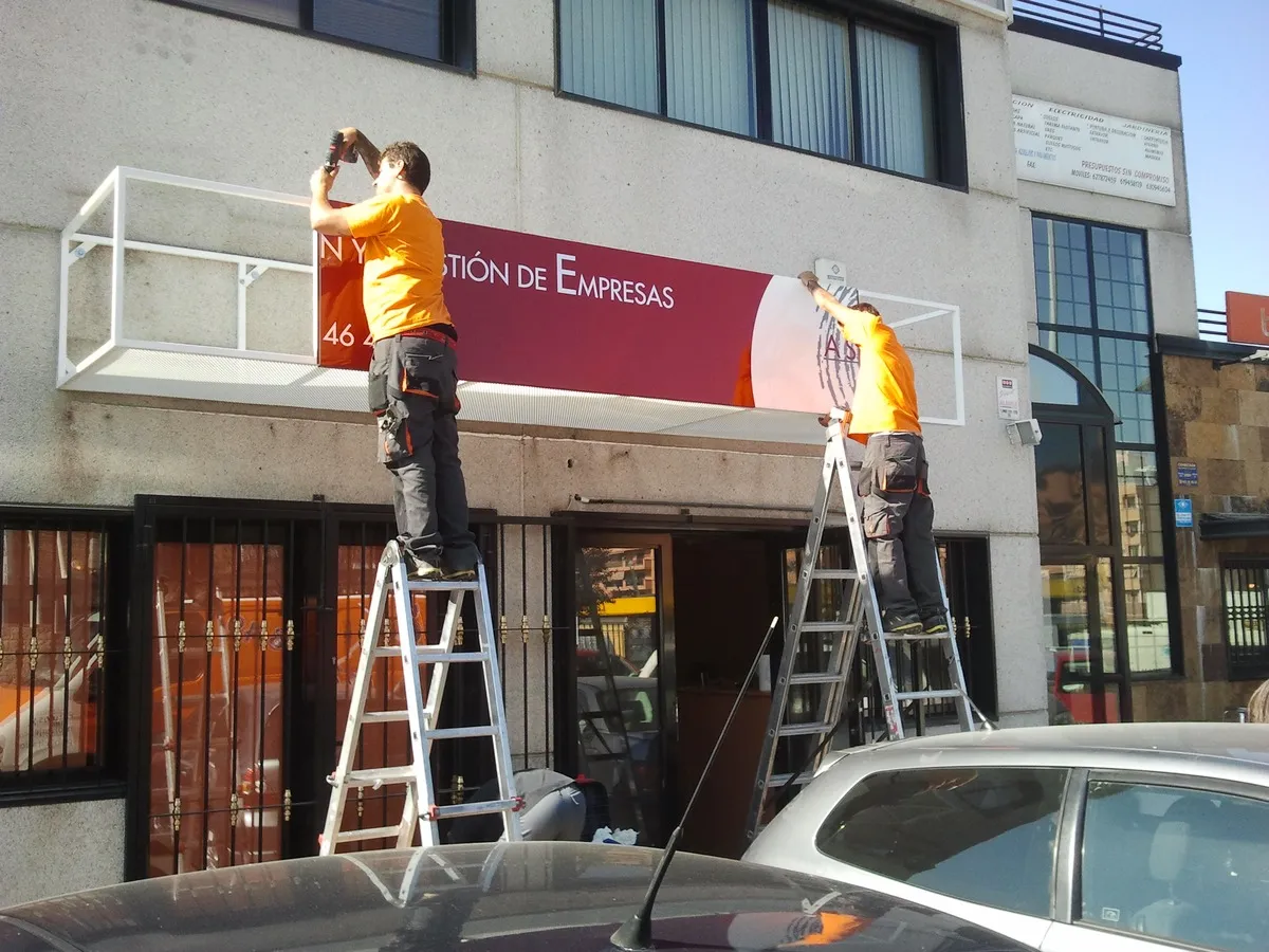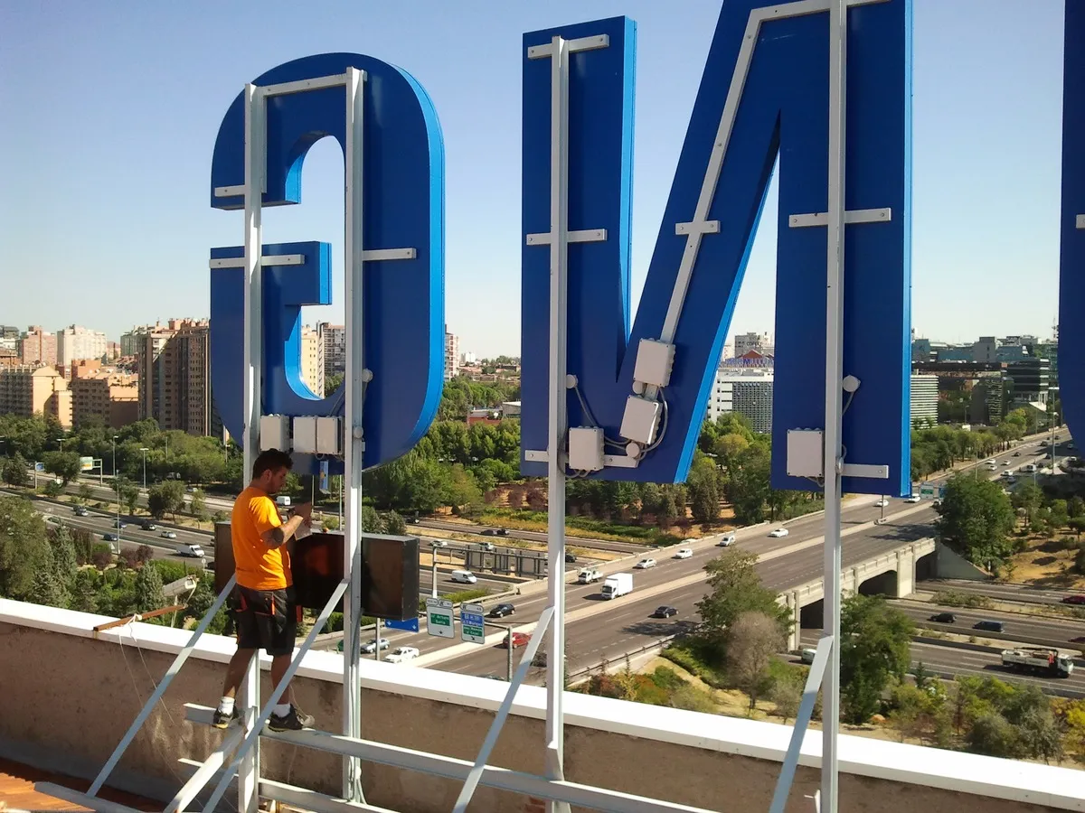 El montaje de rótulos combina técnicas tradicionales de instalación física con medios de elevación mecánica siempre cumpliendo con las estrictas medidas de seguridad laboral.